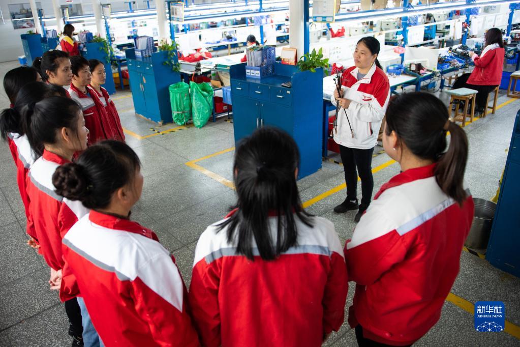 3月7日,在汨羅市神鼎山鎮豐倉村的“巾幗車間”,工作人員在做新產品生產培訓。