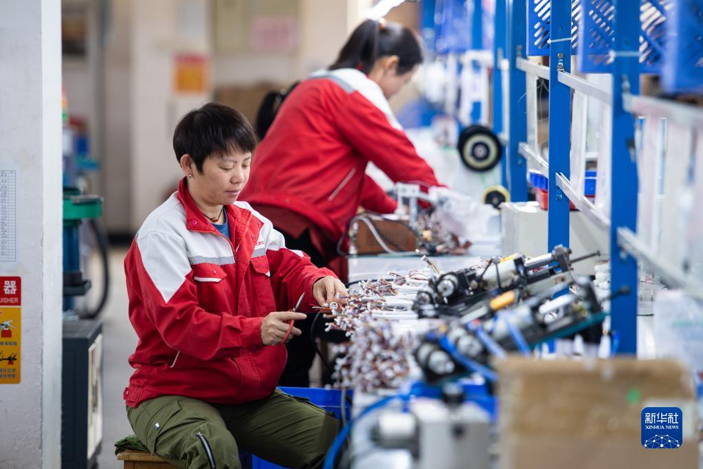 3月7日,在汨羅市神鼎山鎮豐倉村的“巾幗車間”,工作人員在處理數據線線頭。