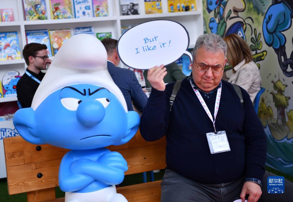 3月7日,參觀者在意大利博洛尼亞國際兒童書展上與卡通玩偶合影。