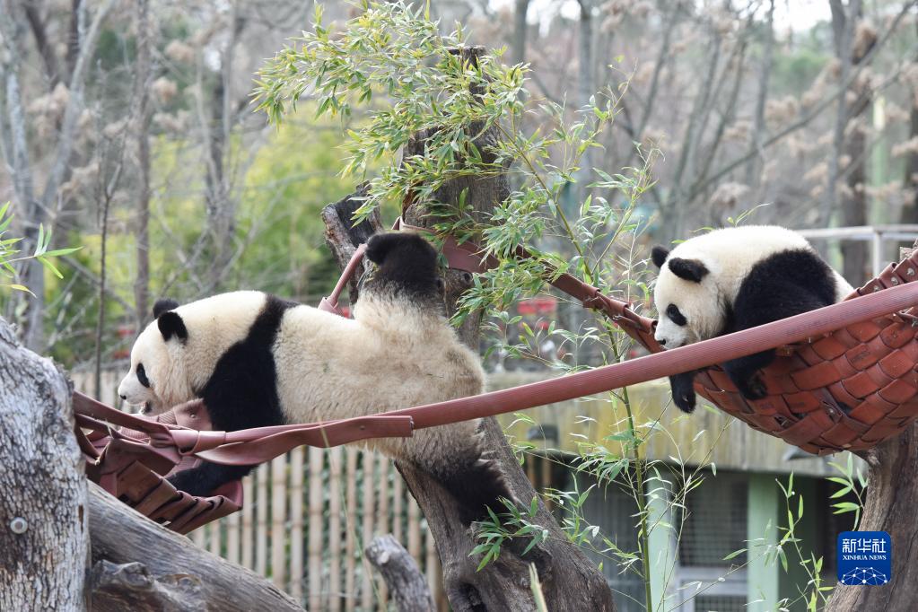 3月7日,大熊貓友友和久久在西班牙馬德里動物園內玩耍。