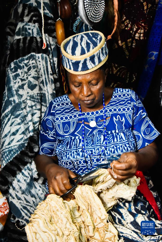 恩多普是主要流行于喀麥隆西部大區的一種布料,可以制成衣物、帽子和項鏈等。制作過程中,先用墨線在白色棉布上繪制紋樣,再用干燥的棕櫚葉脈做線把紋樣扎起來,經靛藍的植物染料浸染后,拆去棕櫚葉脈,便得到藍底白紋的恩多普。如今,眾多喀麥隆婦女投入恩多普制作領域,這不僅改善了她們的生活,也推動了文化的傳承。