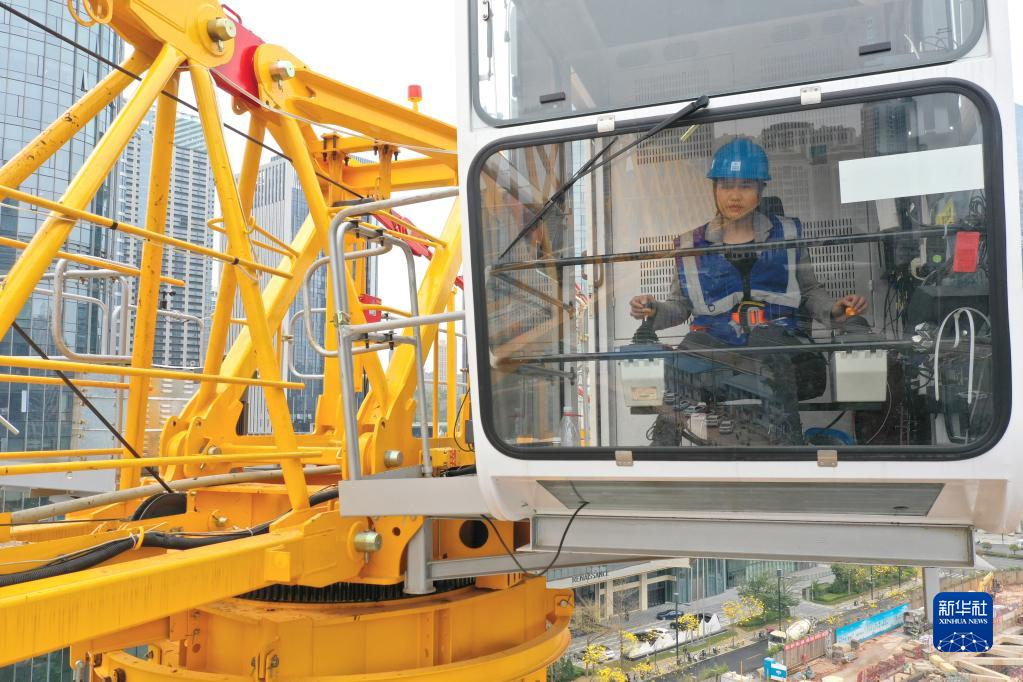 3月7日,在廣西南寧市良慶區五象大道中建三局一公司南寧中銀金融中心項目建設工地,覃桂英在開塔吊(無人機照片)。