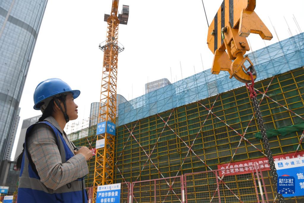 3月7日,在廣西南寧市良慶區五象大道中建三局一公司南寧中銀金融中心項目建設工地,覃桂英在做塔吊地面指揮。