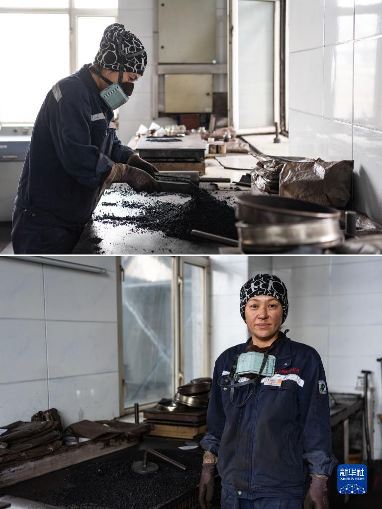 拼版照片:上圖為在黑龍江省七臺河市,寶泰隆新材料股份有限公司焦化廠工人左冰冰在制作煤樣,以便進行煤質分析;下圖:左冰冰在崗位上留影(3月7日攝)。
