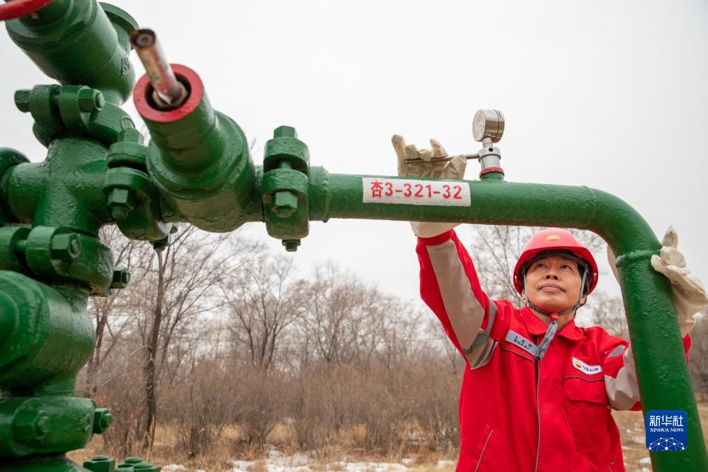 3月7日,在大慶油田第四采油廠第一作業區,北六隊采油工王莉娜在測取水井油壓。