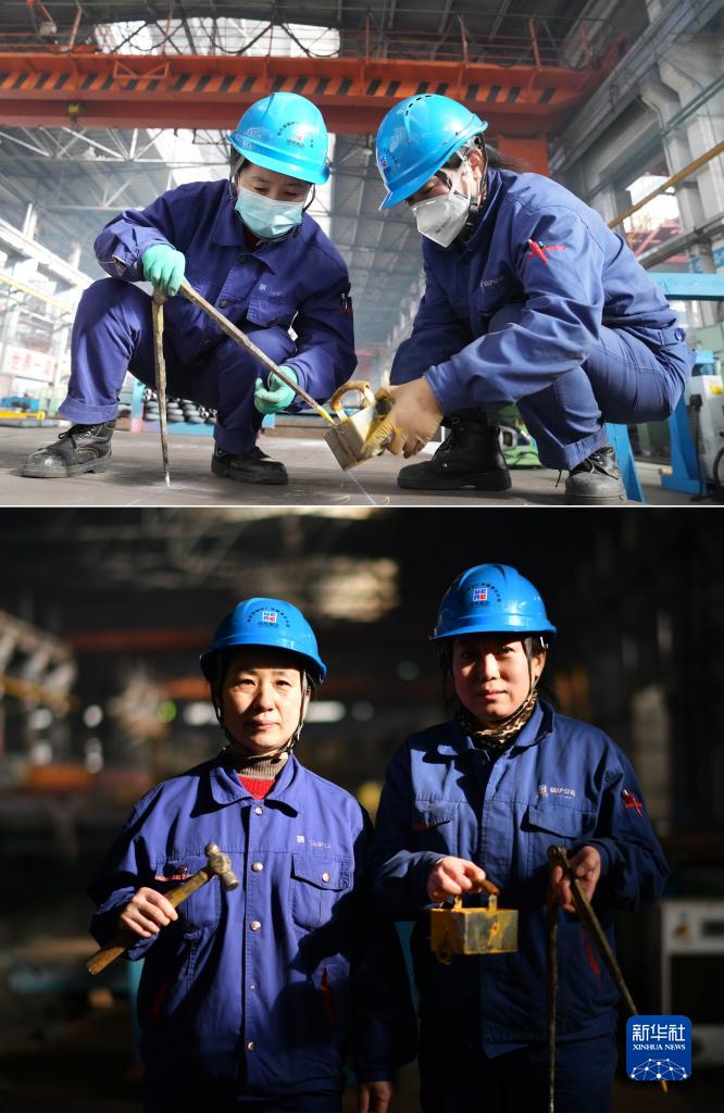 拼版照片:上圖為哈電集團哈爾濱鍋爐廠有限責任公司劃線工劉歷(左)和劉莉莉在作業中;下圖為劉歷(左)和劉莉莉在生產車間(3月6日攝)。