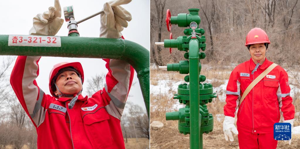拼版照片:左圖為大慶油田第四采油廠第一作業區北六隊采油工王莉娜在測取水井油壓;右圖為王莉娜在崗位上留影(3月7日攝)。