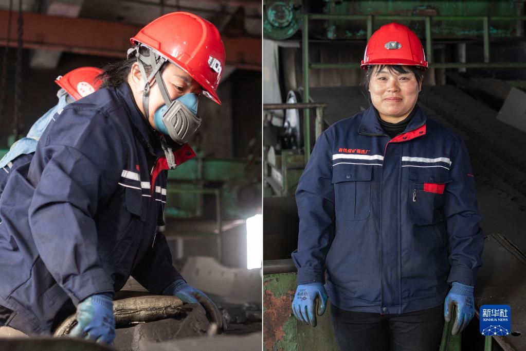 拼版照片:左圖為在黑龍江省七臺河市,龍煤集團七臺河礦業公司新鐵煤礦篩選廠手選班班長曲兆香從動態煤堆中挑選矸石;右圖,曲兆香在崗位上留影(3月7日攝)。