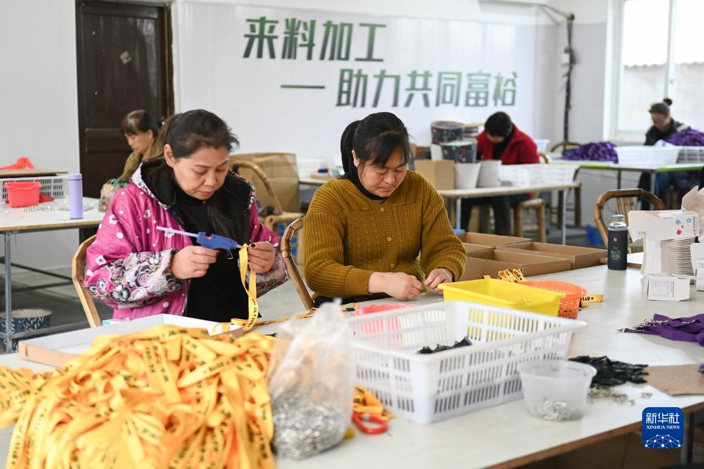 3月8日,村民在奉化區西塢街道山下地村來料加工工坊從事來料加工。