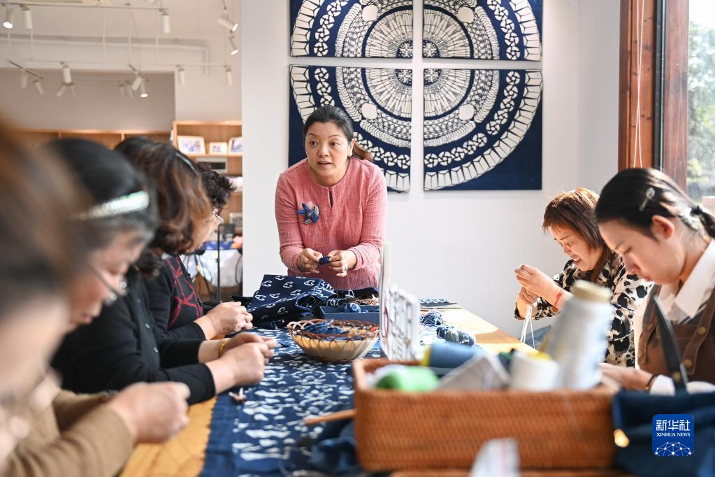3月8日,在奉化區西塢街道雷山村“七彩巧婦”共富工坊,寧波市非物質文化遺產藍印花布印染技藝代表性傳承人張劍峰(中)向村民演示手工飾品的制作方法。目前,該工坊已帶動雷山村30余位女性開展來料加工制作。