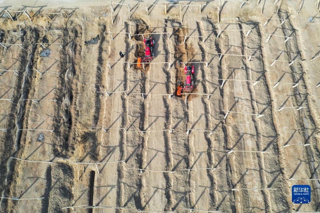 3月8日,在吐魯番市高昌區葡萄鎮,農民操作開墩機在葡萄地里作業(無人機照片)。