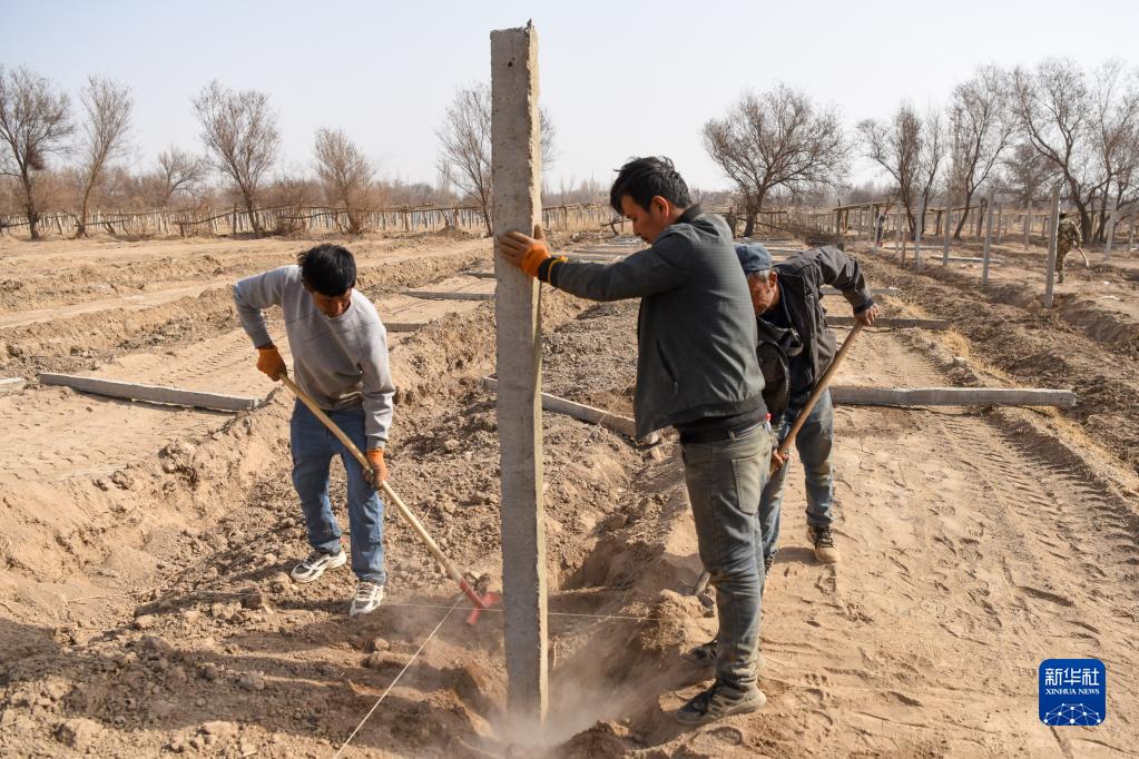 3月8日,在吐魯番市高昌區葡萄鎮,農民在進行葡萄架式改造工作。