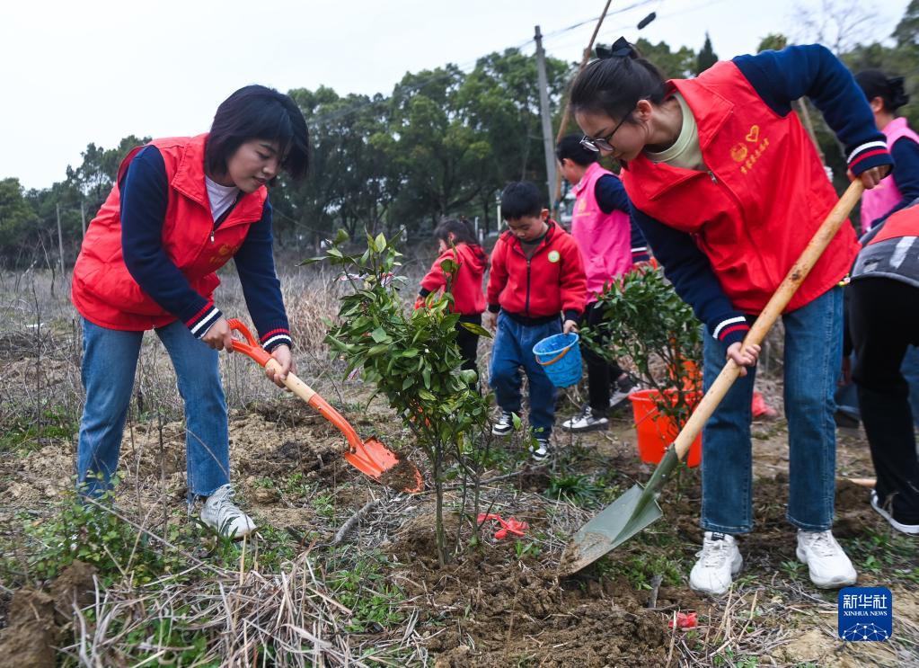 3月8日,在長興縣李家巷鎮青草塢村的荒地上,孩子們在老師和志愿者的帶領下種下橘子樹苗。