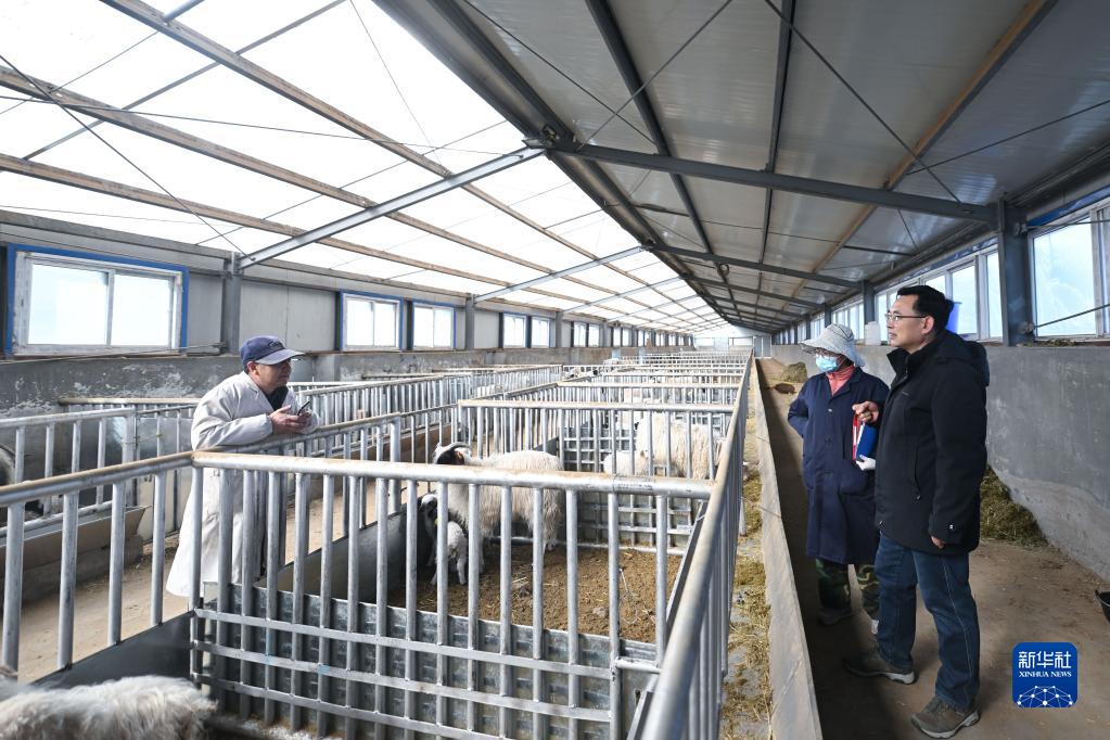 2月24日,在青海省海北藏族自治州海晏縣西海鎮,董全民(右一)在畜棚內與牧民交流。
