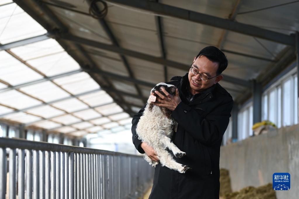 2月24日,在青海省海北藏族自治州海晏縣西海鎮,董全民在畜棚內查看羊羔生長情況。