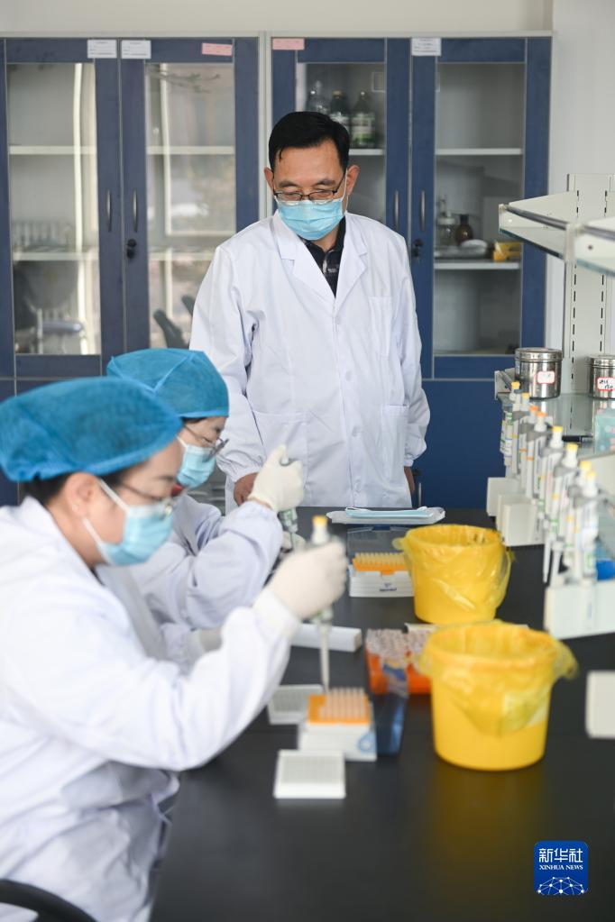 2月24日,在位于青海省海北藏族自治州的青海省高寒草地適應性管理重點實驗室,董全民(右一)在指導科研人員做實驗。