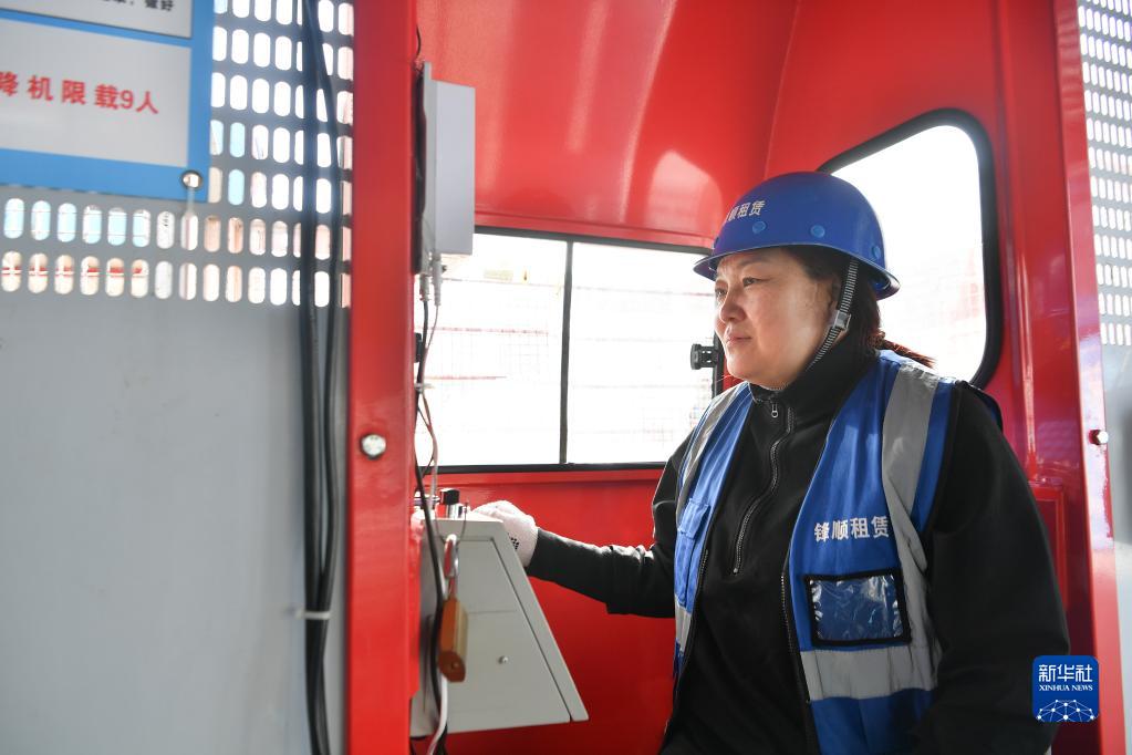 3月8日,在陜西省西安市未央區一處建筑工地,中建三局西北公司電梯司機劉會瓊在施工現場工作。