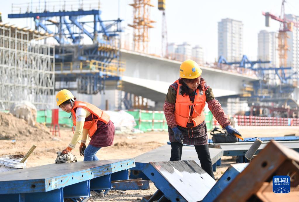 3月8日,在位于陜西省西安市國際港務區的水流路跨灞河大橋項目施工現場,中建三局西北公司模板工趙菊華(左)、汪仕英在施工現場工作。