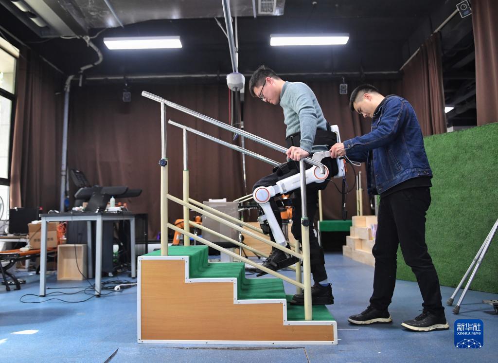 3月6日,電子科技大學機器人研究中心科研人員在幫一名截癱患者體驗外骨骼機器人上下樓梯康復訓練功能。