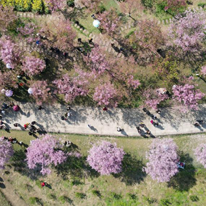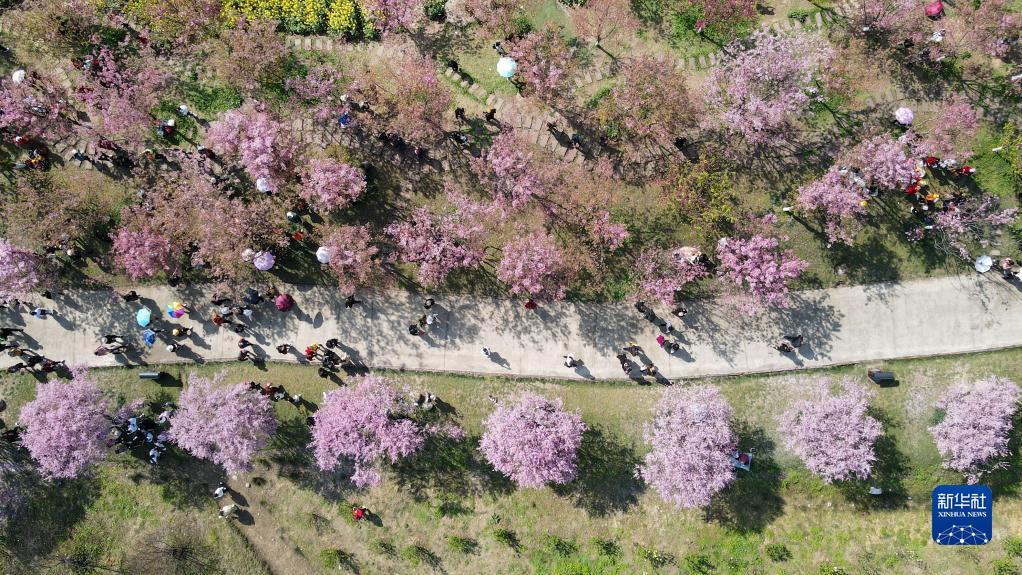 這是3月8日拍攝的都江堰市青城山鎮“問花村”櫻花大道一角(無人機照片)。