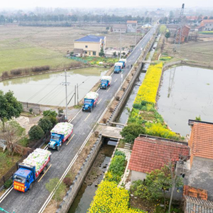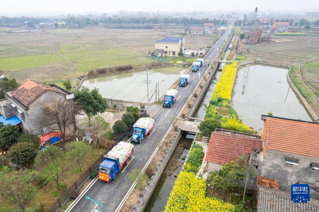 3月8日,送肥下鄉的車隊行駛在湖南省常德市澧縣夢溪鎮的道路上(無人機照片)。
