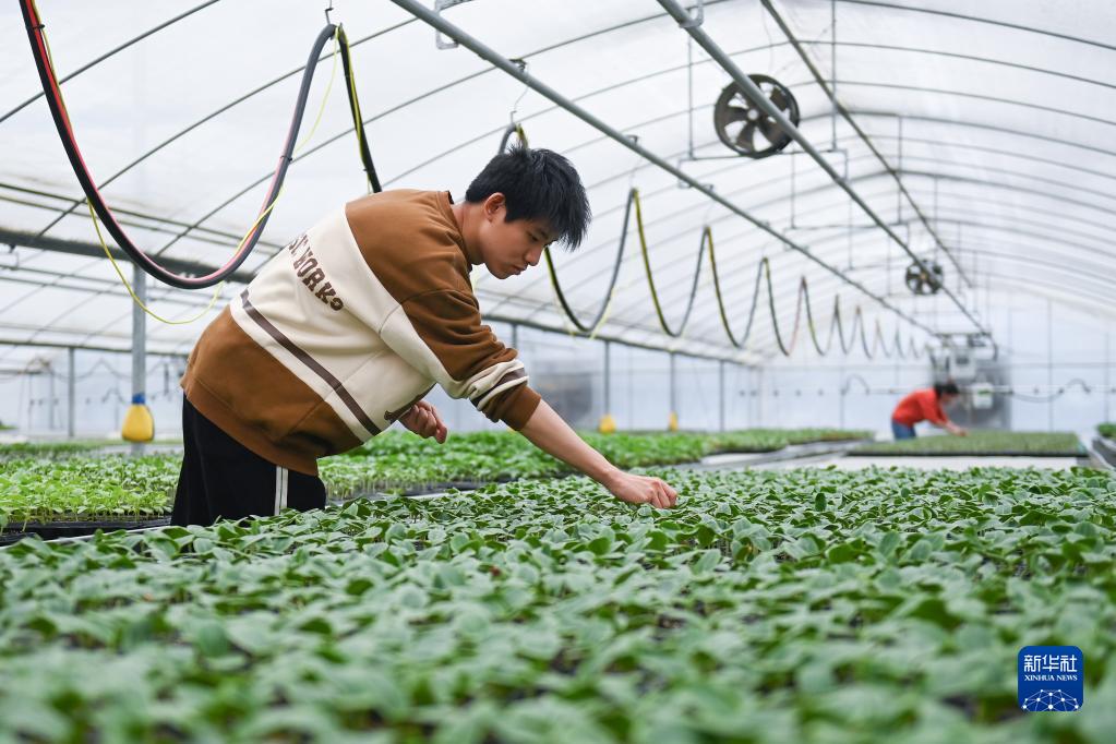 3月8日,工作人員在杭州市臨平區的杭州康成農業科技有限公司的溫室內查看菜苗長勢。