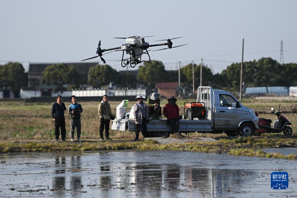 種糧戶在寧波市奉化區西塢街道四維村的水稻秧田操控植保無人機施肥(3月7日攝)。