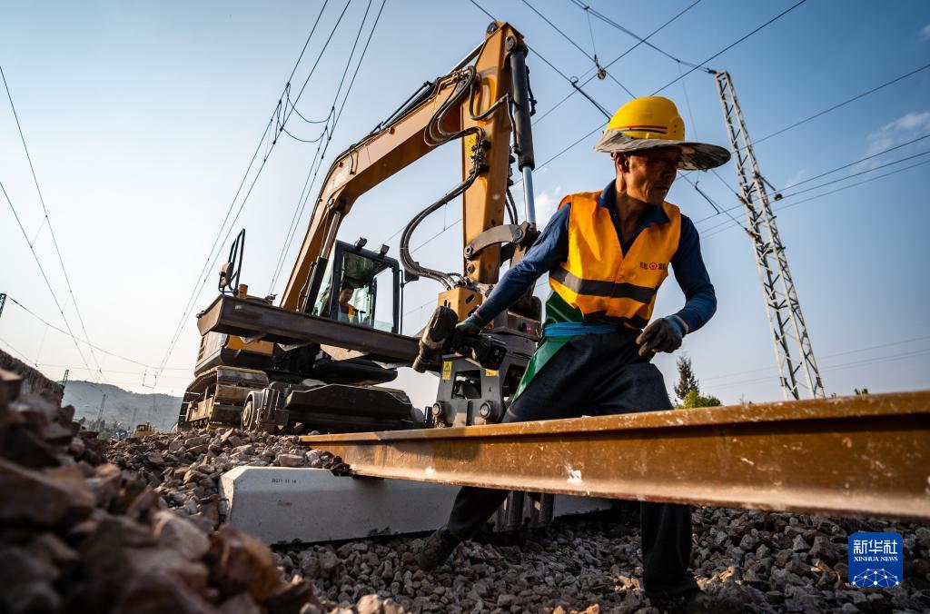 作業人員操作換枕設備對鐵路進行換枕作業(3月8日攝)。