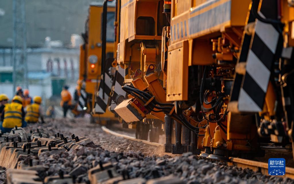 養路機械沿著鐵路進行線路搗固作業(3月8日攝)。
