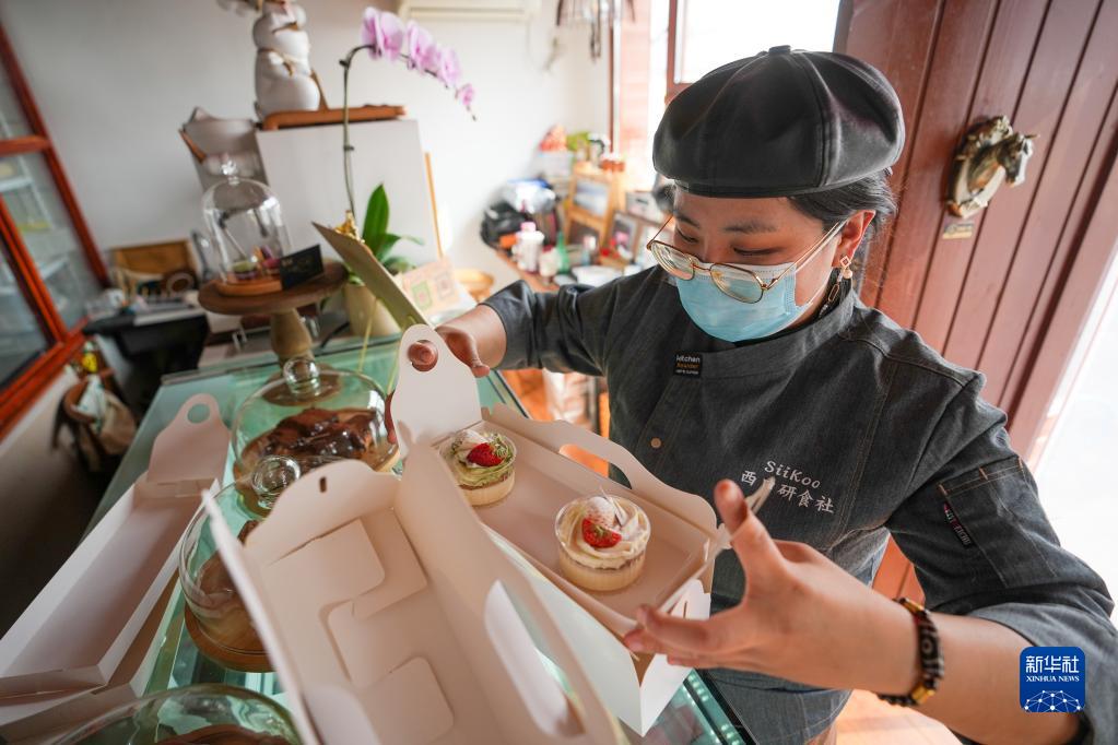 在北京市密云區金叵羅村的西口研食社內,劉甜恬為客人打包使用了小米作為原料制作的小米布?。?023年3月7日攝)。