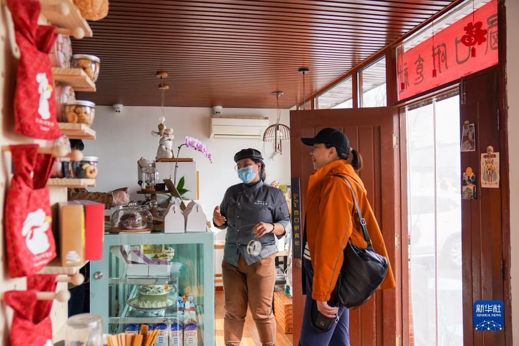 在北京市密云區金叵羅村的西口研食社內,劉甜恬(中)為客人介紹店內的特色產品(2023年3月7日攝)。