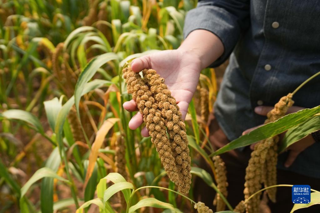在北京市密云區金叵羅村的谷子地里,劉甜恬展示飽滿的谷穗(2022年9月28日攝)。