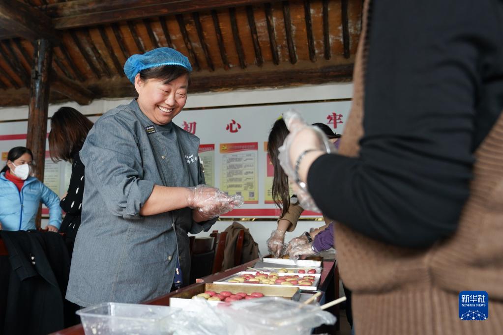 在北京市密云區金叵羅村,“三嫂子”楊紅艷(左)在為來村參觀并進行小米酥制作體驗的客人示范小米酥制作(2023年3月7日攝)。