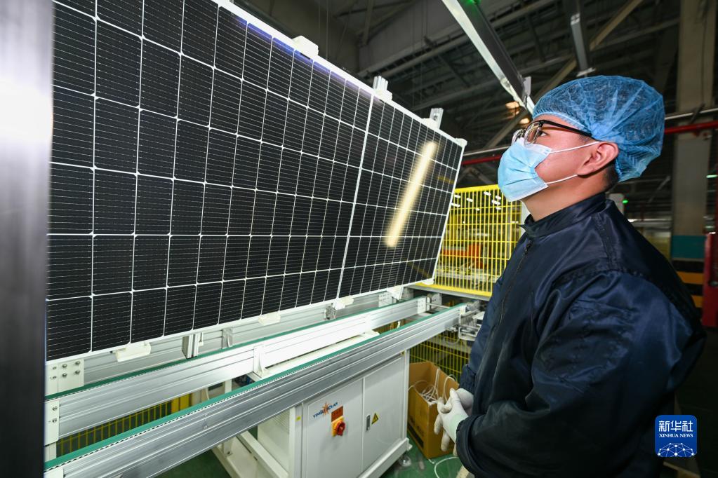 在天津一家新能源公司,工作人員在對光伏板進行質量檢查(3月7日攝)。