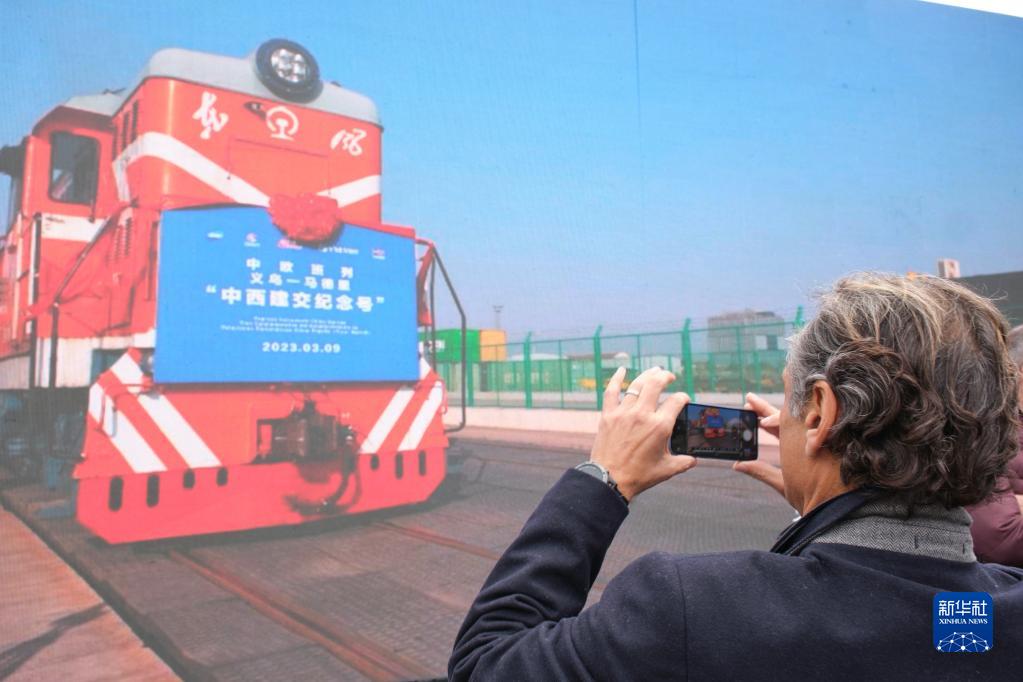 3月9日,在西班牙馬德里,參觀者拍攝“中西建交紀念號”中歐班列從中國浙江義烏開出的直播畫面。