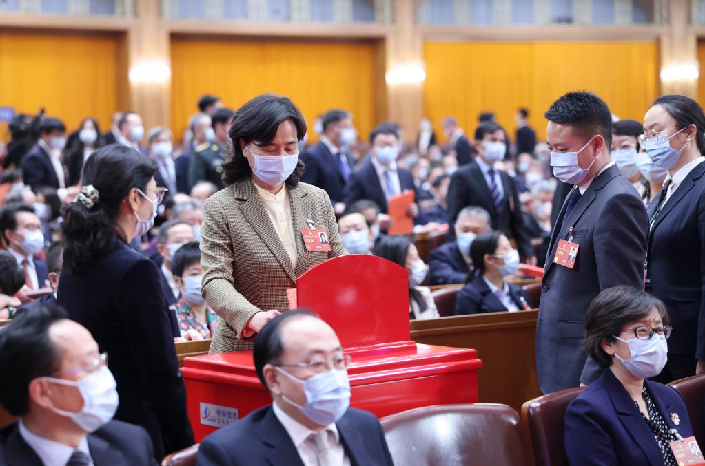 3月10日,全國政協十四屆一次會議在北京人民大會堂舉行第三次全體會議。這是委員在投票。