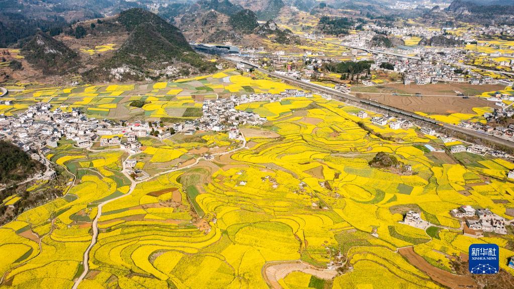 近日,貴州省六盤水市六枝特區木崗鎮的16000余畝油菜花競相綻放,與田地、民居、道路構成了美麗的春日畫卷。