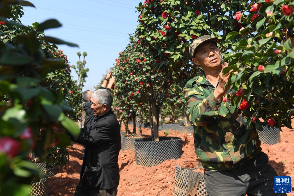 3月10日,在金華市婺城區羅店鎮的一家標準化苗圃,工作人員在修剪茶花。