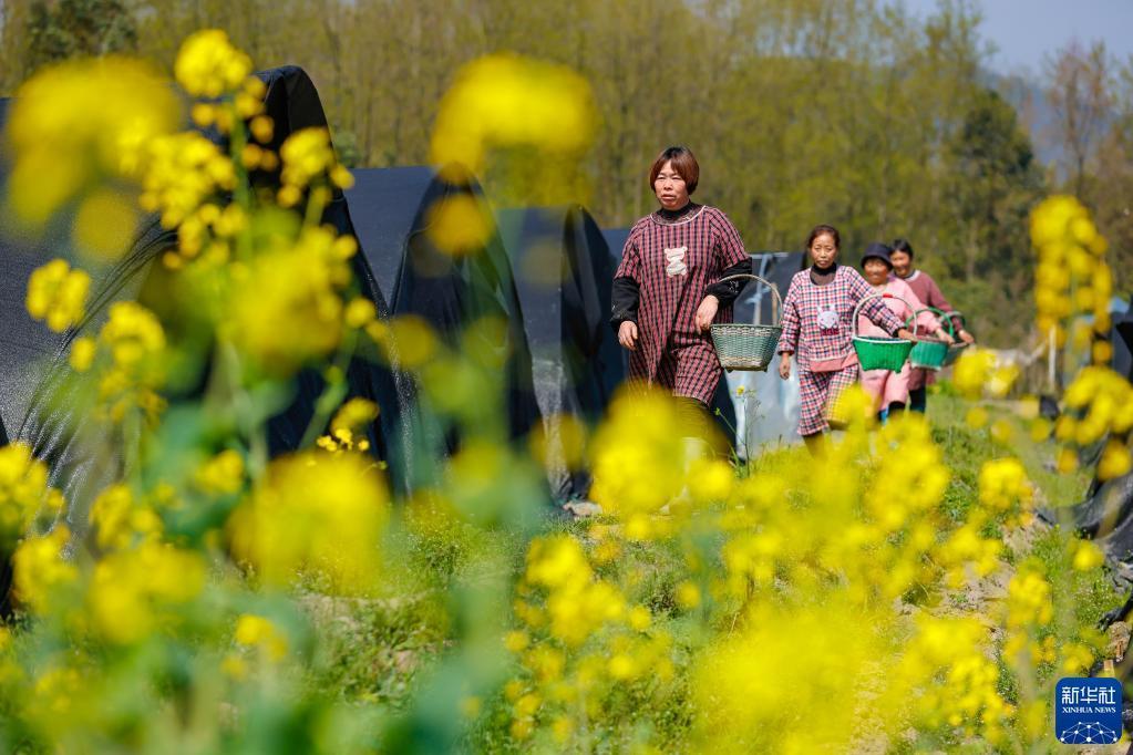 在四川省成都市大邑縣新場古鎮燈籠社區,當地村民行走在種植羊肚菌的大棚旁(3月8日攝)。