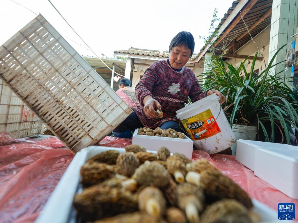 在四川省成都市大邑縣新場古鎮燈籠社區,村民在整理剛采摘的羊肚菌(3月8日攝)。