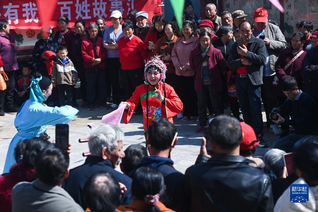 3月10日,在浙江省杭州市淳安縣屏門鄉屏前村的傳統廟會上,人們在觀看屏門睦劇表演。