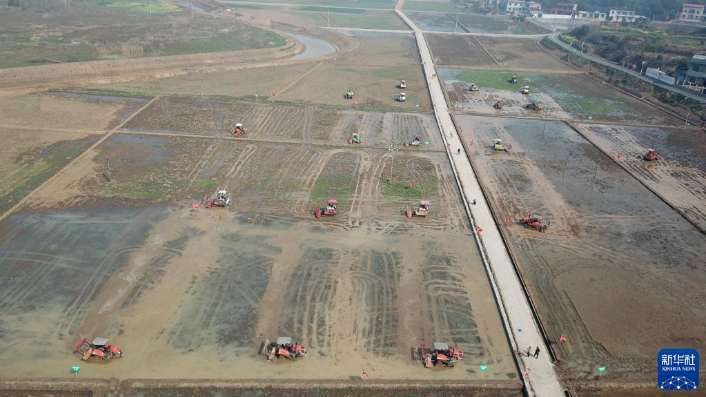 當日,在湖南省湘潭市湘鄉市舉行的湖南省供銷合作社農業社會化服務大聯盟成立儀式現場,種糧能手在200畝高標準農田里操作農機設備進行“比武”,通過拖拉機犁田、旋耕機翻耕、植保無人機飛防等農機技能比賽提升農業服務水平,助力春耕備耕。