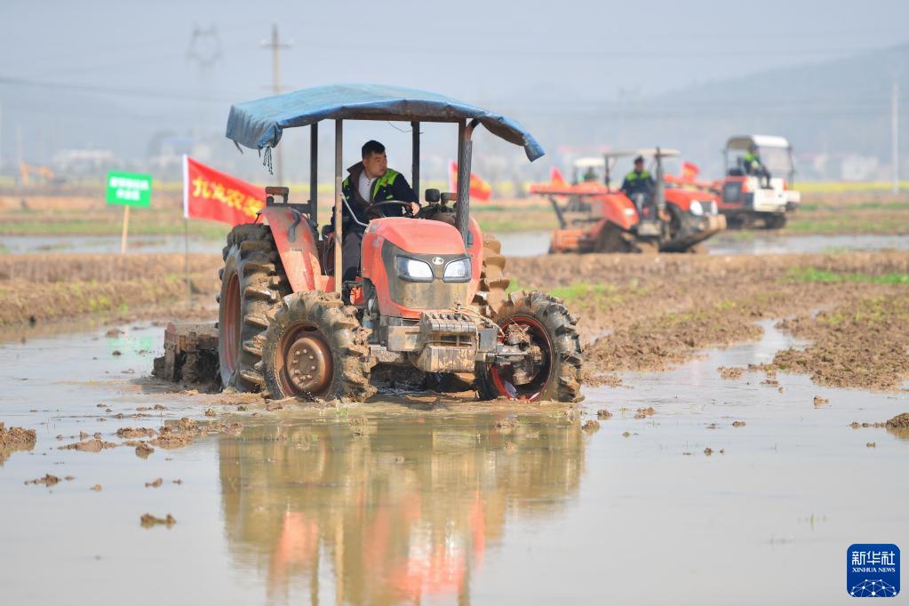 當日,在湖南省湘潭市湘鄉市舉行的湖南省供銷合作社農業社會化服務大聯盟成立儀式現場,種糧能手在200畝高標準農田里操作農機設備進行“比武”,通過拖拉機犁田、旋耕機翻耕、植保無人機飛防等農機技能比賽提升農業服務水平,助力春耕備耕。
