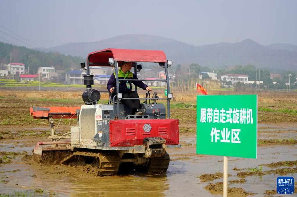 當日,在湖南省湘潭市湘鄉市舉行的湖南省供銷合作社農業社會化服務大聯盟成立儀式現場,種糧能手在200畝高標準農田里操作農機設備進行“比武”,通過拖拉機犁田、旋耕機翻耕、植保無人機飛防等農機技能比賽提升農業服務水平,助力春耕備耕。