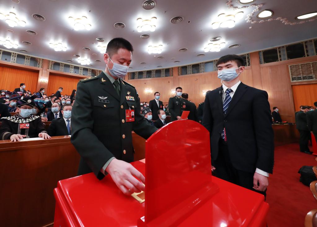 3月10日,十四屆全國人大一次會議在北京人民大會堂舉行第三次全體會議。這是代表在投票。