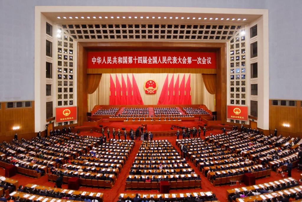 3月10日,十四屆全國人大一次會議在北京人民大會堂舉行第三次全體會議。全體會議各項議程進行完畢后,舉行中華人民共和國第十四屆全國人民代表大會第一次會議憲法宣誓儀式。