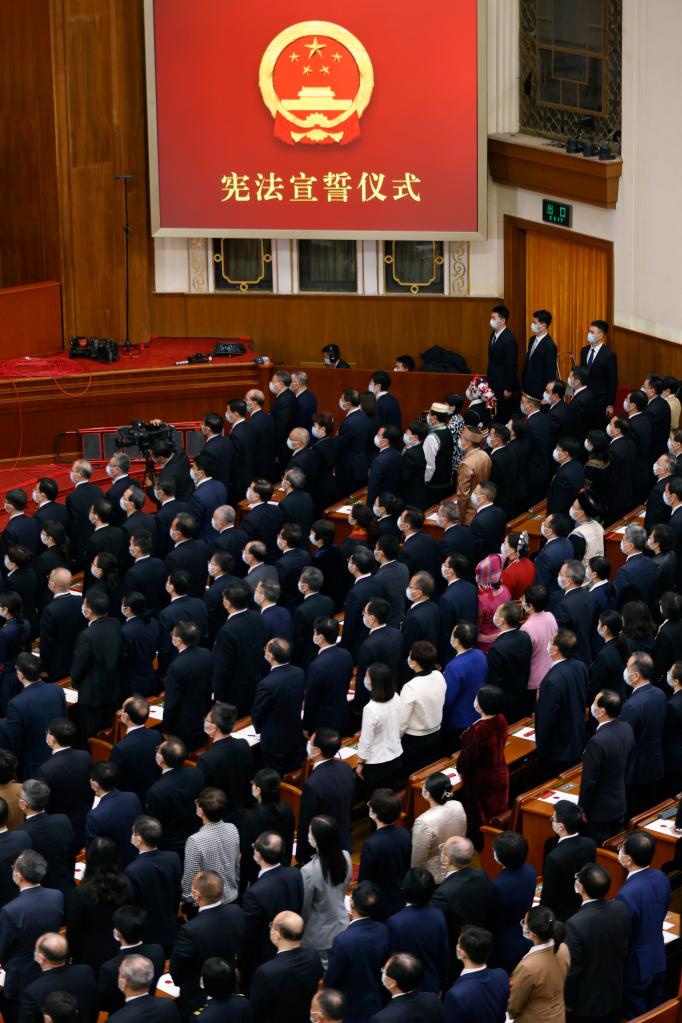 3月10日,十四屆全國人大一次會議在北京人民大會堂舉行第三次全體會議。全體會議各項議程進行完畢后,舉行中華人民共和國第十四屆全國人民代表大會第一次會議憲法宣誓儀式。
