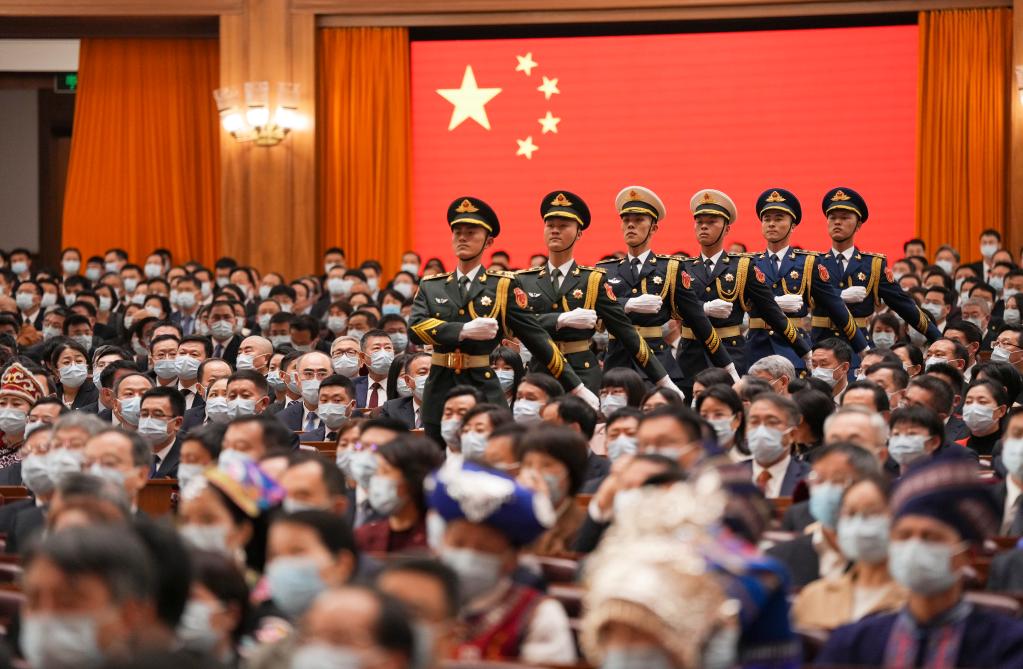 3月10日,十四屆全國人大一次會議在北京人民大會堂舉行第三次全體會議。全體會議各項議程進行完畢后,舉行中華人民共和國第十四屆全國人民代表大會第一次會議憲法宣誓儀式。這是中國人民解放軍儀仗隊禮兵正步行進。