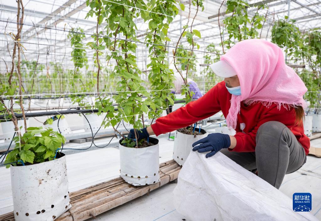 農民在寧夏賀蘭縣洪廣鎮欣榮村紅樹莓種植基地溫室內勞作(3月10日攝)。