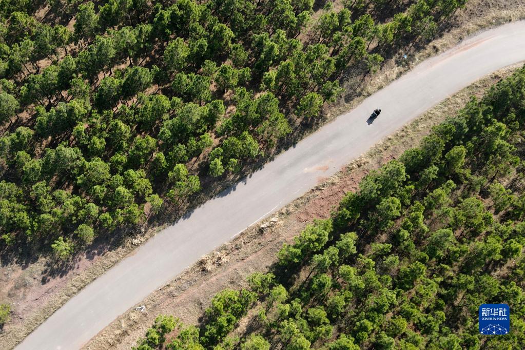 3月10日,張偉騎著電動車在五河縣朱頂鎮陸沖山的山林中巡護(無人機照片)。
